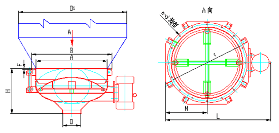 | 序號 | 型號 | 振動斗直徑A | 法蘭盤外徑B | 法蘭盤內徑C | 出料口直徑Dmin | 電機相關尺寸E | 法蘭盤厚度H | 振動斗高度H | 長度L | 寬度M | 法蘭盤螺孔 | 電機功率(kw) | 一般相配料倉直徑D1 | 一般相配料倉容積(m3) | 重量(kg) | |