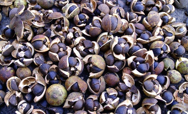 蒴果球形或卵圓形,直徑20-60毫米,分為1-4室,4片3片或2片裂開,每室有種子1-3粒,果粒11-36毫米不等,形狀不規則。木質,中軸粗厚;苞片及萼片脫落后留下的果柄長3-5毫米,粗大,有環狀短節;ㄆ诙洪g。