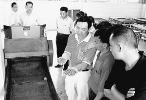 圖為廣西茶科所的茶葉專家(右三)在給昭平縣的山區農民講解“茶葉解塊篩分機”的使用方法。