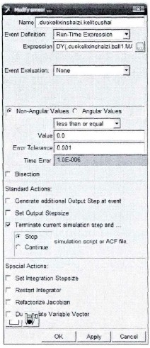 2.為了得到物料的透篩時間,需要在振動篩虛擬樣機模型中建立一個Sensor,其作用是當物料透過篩面時,使仿真過程停止并顯示出物料透篩的時間。振動篩篩面所在的位置為>^=0,所以,物料透篩的條件是切,即當物料顆粒質心位置的豎直方向分量小于等于0時認為物料透篩[”’12]。ADAMS軟件檢測到物料透篩后自動停止仿真過程,激發條件是:DY (.duokelixinshaizi.balll.MARKER_26,.duokelixinshaizi.PART2.MARKER__29,.duokelixinshaizi.PART2.MARKER_29) <0,動作的結果選擇為停止當前仿真。Sensor設置的對話框如圖4.1所示;