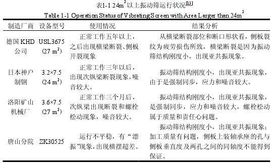 篩分機(jī)械的大型化對(duì)機(jī)械結(jié)構(gòu)的強(qiáng)度和剛度提出了高要求,振動(dòng)篩分機(jī)械結(jié)構(gòu)增 大,對(duì)其振動(dòng)強(qiáng)度的要求也相應(yīng)增加。篩寬增加一倍,管梁的應(yīng)變要增加許多倍, 所以,管梁的截面尺寸會(huì)迅速增大,這使得地基的動(dòng)負(fù)荷也成倍增加,給機(jī)械制造 業(yè)帶來極大困難 [6,7] 。另外,結(jié)構(gòu)增大后,必然引起篩體的參振質(zhì)量和所需的激振力 增大,則篩體的動(dòng)負(fù)荷也隨即增大,引起篩體結(jié)構(gòu)強(qiáng)度和剛度不足,導(dǎo)致篩體變形 過大、側(cè)板撕裂、橫梁斷裂、焊縫開裂,嚴(yán)重影響篩分機(jī)械的使用壽命 [8-11] 。表 1-1 是國內(nèi) 24 m 2 以上振動(dòng)篩分機(jī)使用情況的調(diào)研和統(tǒng)計(jì)分析。國內(nèi)生產(chǎn)的振動(dòng)篩使用壽命 一般為 3~5 年,其中大型振動(dòng)篩一般為 2 年左右,德國和波蘭等國一般為 5~8 年, 美國為 5 年以上,原蘇聯(lián)規(guī)定第一次大修前,使用時(shí)間為 14000~18000 h [6-9] 。我國 大型振動(dòng)篩的設(shè)計(jì)和制造起步較晚,技術(shù)還不夠成熟,主要依靠引進(jìn)國外圖紙和技 術(shù) [8] 。由于國外的技術(shù)壁壘和國內(nèi)制造技術(shù)和材料的限制,使得國內(nèi)制造的大型篩 運(yùn)行情況一直不理想。選煤生產(chǎn)對(duì)篩分設(shè)備提出了效率高、運(yùn)行可靠、制造成本低、 減少污染(降低噪音)等方面的要求。而目前我國振動(dòng)篩分設(shè)備的設(shè)計(jì)水平還不能滿 足這些要求,尤其是在運(yùn)行的可靠性及零部件的使用壽命等方面與國外先進(jìn)設(shè)備相 比還有一定差距。因此,如何提高我國振動(dòng)篩分設(shè)備的設(shè)計(jì)水平,提高振動(dòng)篩運(yùn)行 的可靠性,是我們面臨的重要課題。