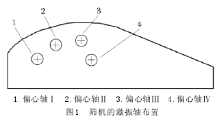 四軸變軌跡等厚振動(dòng)篩是在直線振動(dòng)篩的基礎(chǔ)上 改進(jìn)的,篩機(jī)由 4 根偏心軸激振,并且在中間 2 根偏 心軸之間通過同步齒輪強(qiáng)制同步。其設(shè)計(jì)思路是在普 通直線篩上添加另外 2 根偏心軸,使這 2 根軸產(chǎn)生的 激振力作用線偏離篩箱質(zhì)心,使篩箱做繞質(zhì)心的旋轉(zhuǎn) 運(yùn)動(dòng),旋轉(zhuǎn)運(yùn)動(dòng)和直線運(yùn)動(dòng)的合成便會(huì)產(chǎn)生直線軌跡 的運(yùn)動(dòng),這種變直線軌跡等厚振動(dòng)篩能滿足篩面上各 點(diǎn)拋射強(qiáng)度不同的要求。 對(duì)于多軸的慣性振動(dòng)機(jī)械,為了保證各慣性激振 軸的同步運(yùn)轉(zhuǎn),通常有強(qiáng)迫同步法和自同步法,本文 中四軸變軌跡等厚振動(dòng)篩采用自同步和強(qiáng)制同步結(jié)合 的方式,每根偏心軸都有單獨(dú)電動(dòng)機(jī)驅(qū)動(dòng)。如圖 1 所 示,由于偏心軸Ⅰ和偏心軸 Ⅱ 的偏心質(zhì)量和偏心距 相同,偏心軸 Ⅲ 和偏心軸 Ⅳ 的偏心質(zhì)量和偏心距也 相同,他們可以依據(jù)自同步原理等速反向旋轉(zhuǎn)。偏心 軸Ⅱ和偏心軸Ⅲ通過同步齒輪強(qiáng)制同步,可以調(diào)節(jié) 2 組偏心軸的相位差來改變篩體運(yùn)動(dòng)狀態(tài)。
